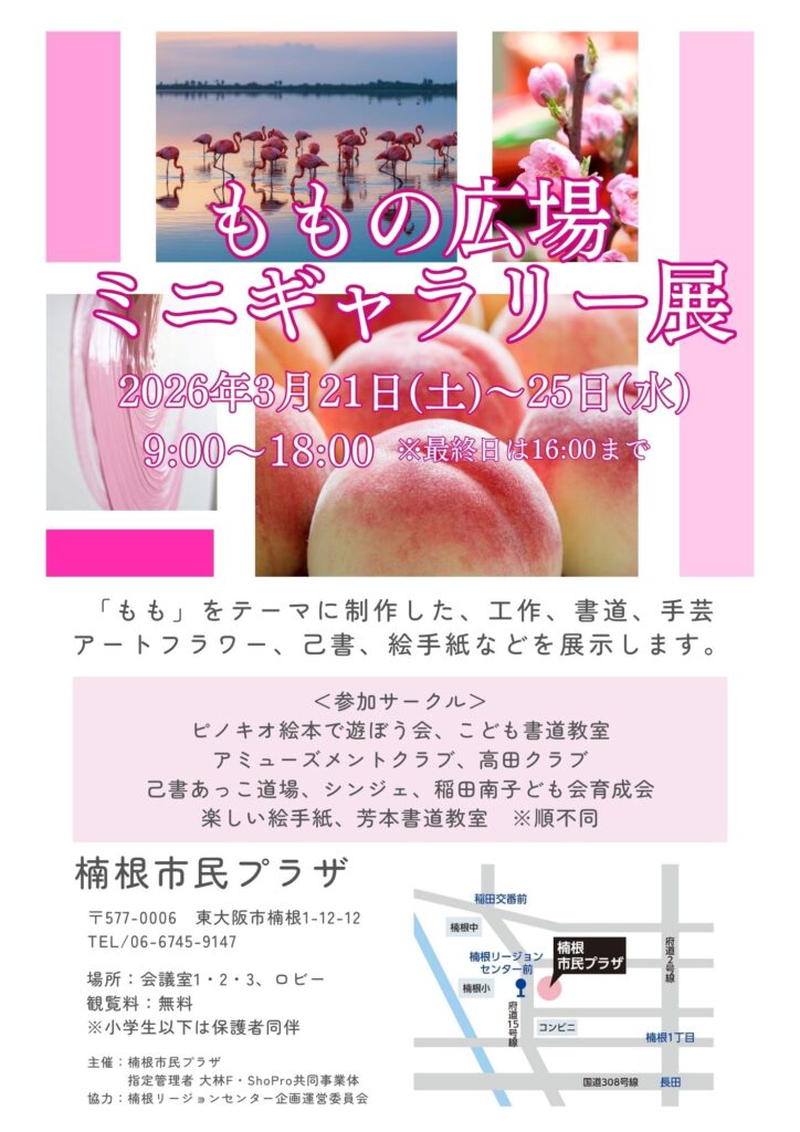 | 申込・問合せ先 | 楠根市民プラザ 〒577-0006 東大阪市楠根1-12-12 電話:06-6745-9147 |